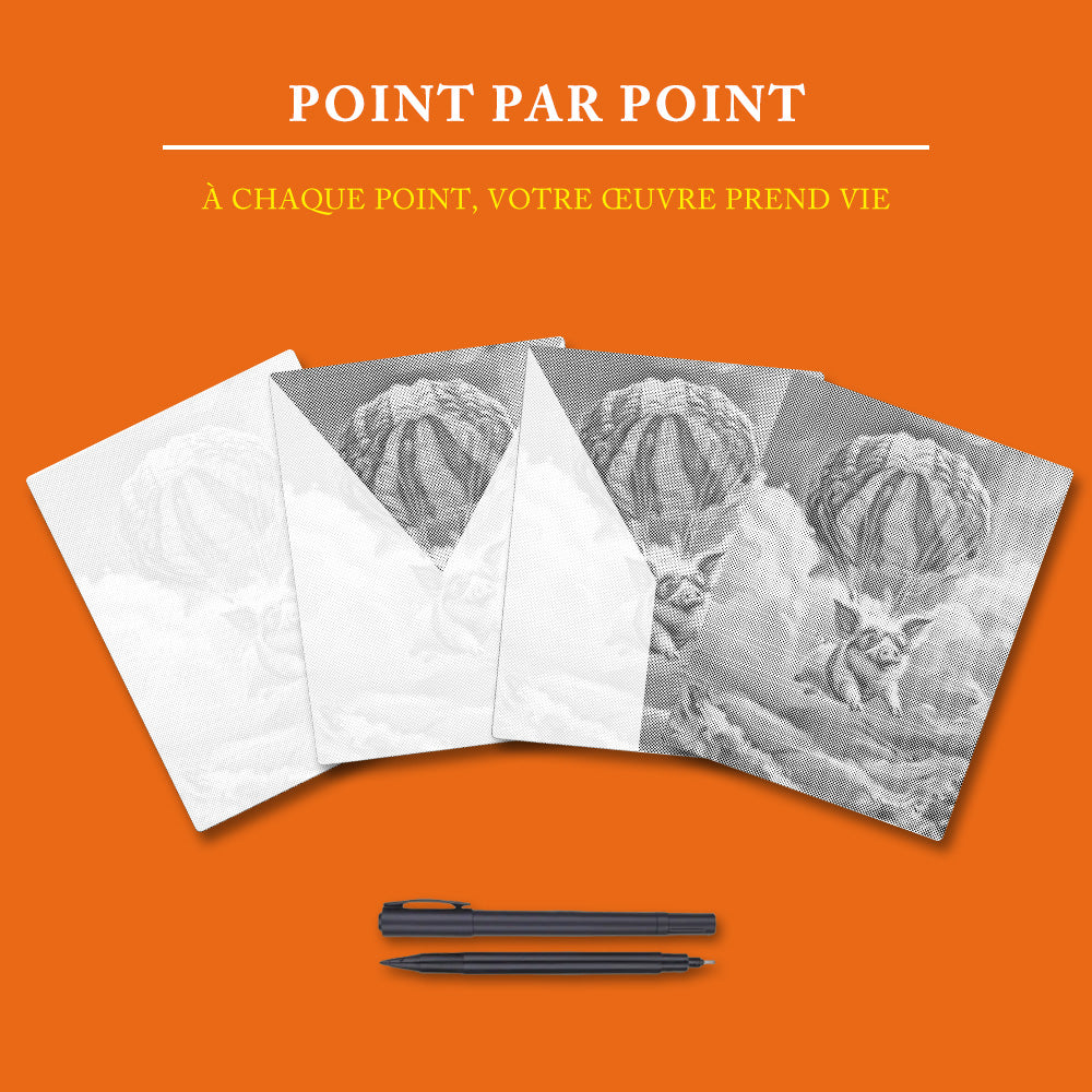 La peinture à points est une technique similaire à la peinture au diamant.Au lieu d’utiliser des strass, vous utilisez des marqueurs spéciaux pour donner vie à votre photo grâce à des points.La toile est imprimée avec des cercles de différentes tailles.En les remplissant, un motif unique apparaît : votre propre peinture à points !Remplissez tous les cercles et regardez votre photo prendre vie et briller.