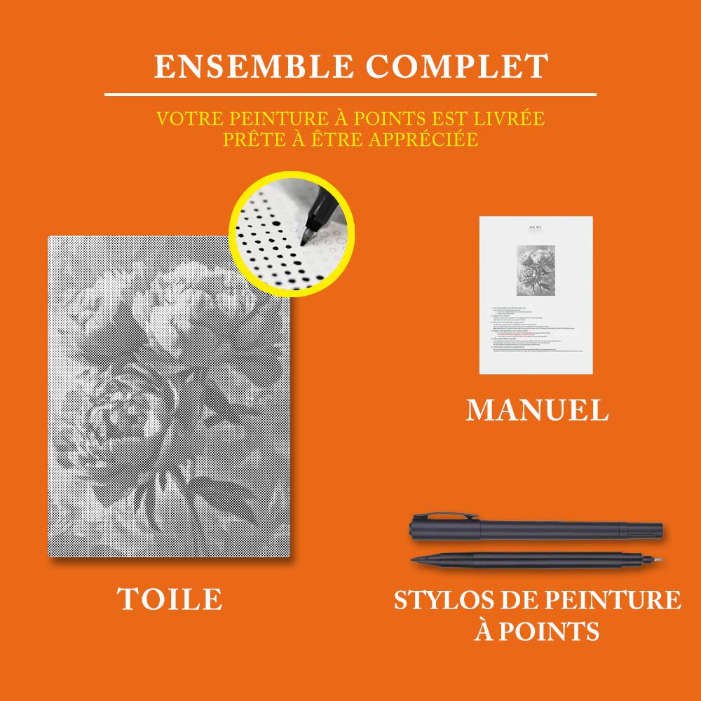 Nos kits personnalisés de peinture à points contiennent tout ce dont vous avez besoin pour commencer immédiatement :