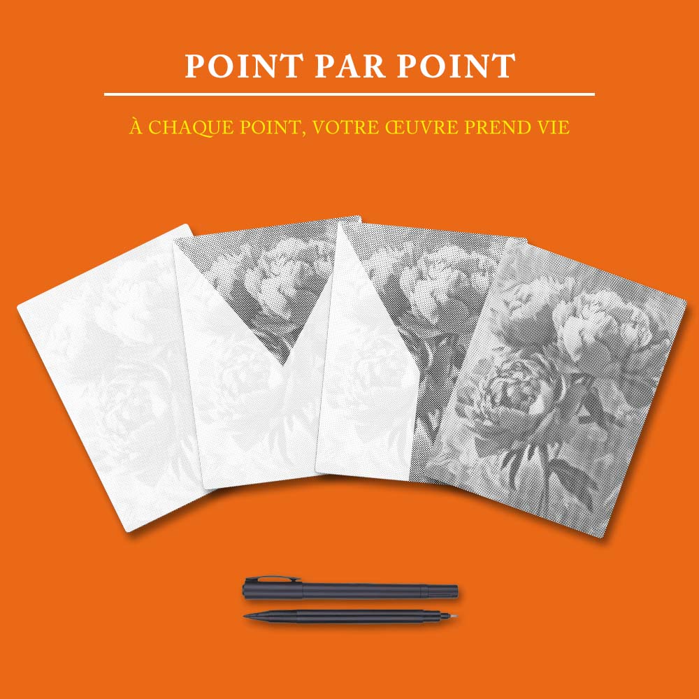 La peinture à points est une technique similaire à la peinture au diamant.Au lieu d’utiliser des strass, vous utilisez des marqueurs spéciaux pour donner vie à votre photo grâce à des points.La toile est imprimée avec des cercles de différentes tailles.En les remplissant, un motif unique apparaît : votre propre peinture à points !Remplissez tous les cercles et regardez votre photo prendre vie et briller.