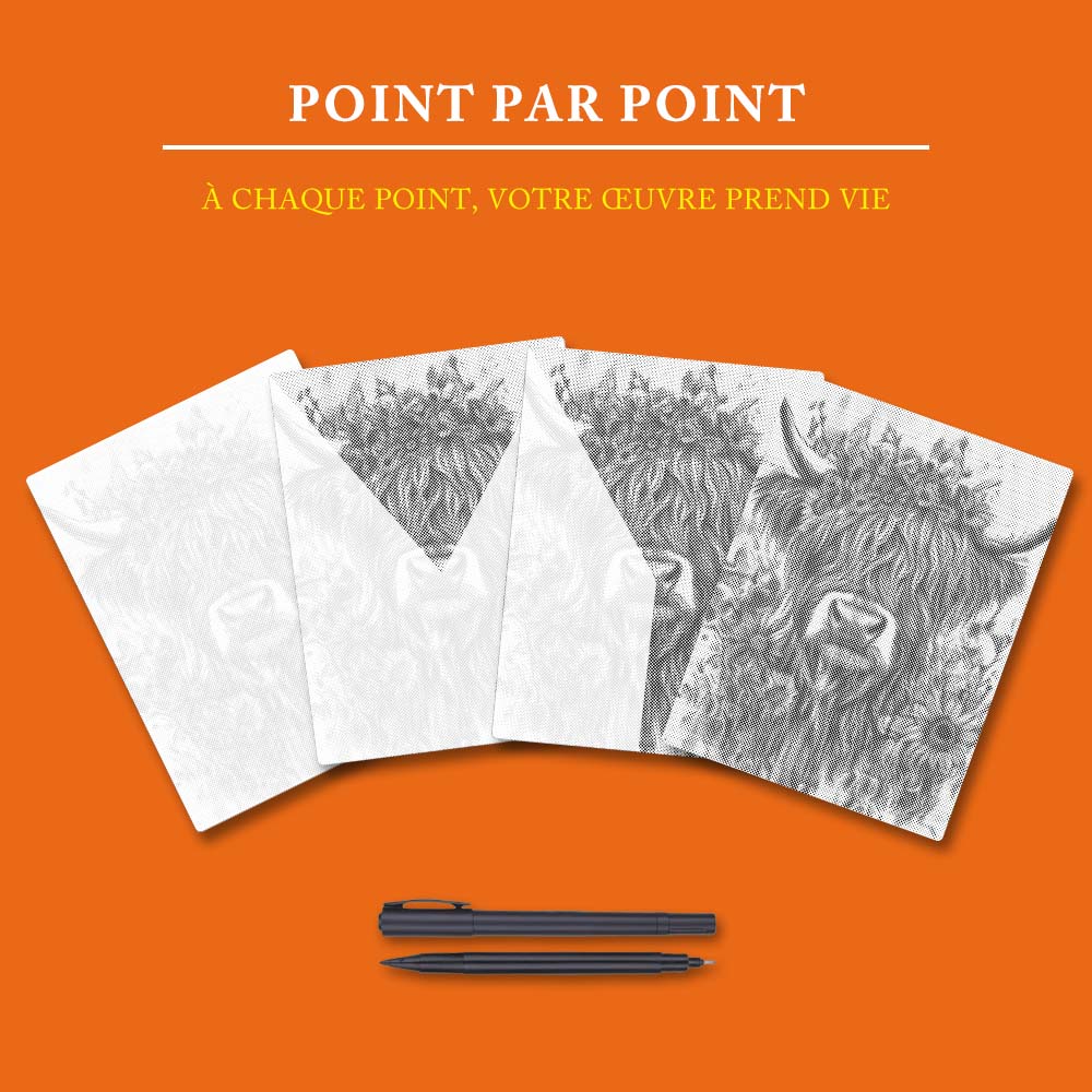 La peinture à points est une technique similaire à la peinture au diamant.Au lieu d’utiliser des strass, vous utilisez des marqueurs spéciaux pour donner vie à votre photo grâce à des points.La toile est imprimée avec des cercles de différentes tailles.En les remplissant, un motif unique apparaît : votre propre peinture à points !Remplissez tous les cercles et regardez votre photo prendre vie et briller.