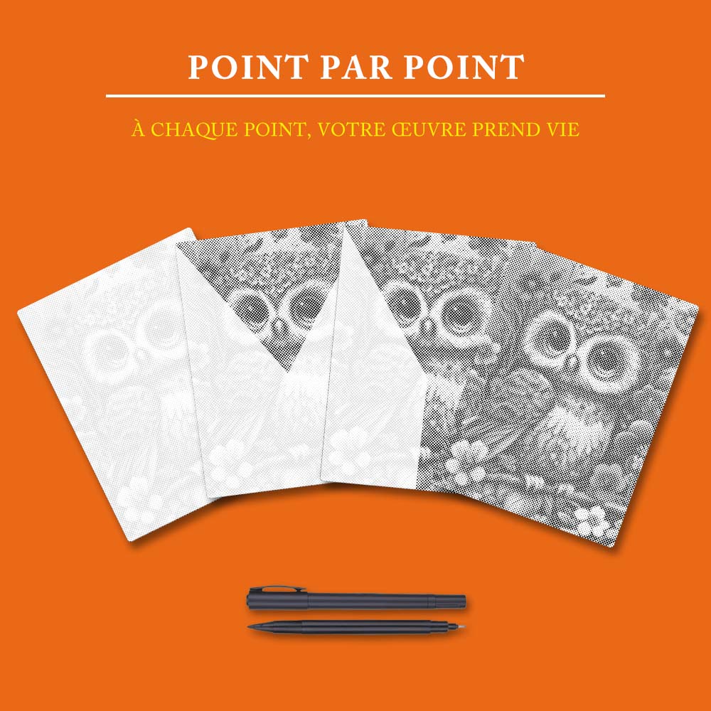 La peinture à points est une technique similaire à la peinture au diamant.Au lieu d’utiliser des strass, vous utilisez des marqueurs spéciaux pour donner vie à votre photo grâce à des points.La toile est imprimée avec des cercles de différentes tailles.En les remplissant, un motif unique apparaît : votre propre peinture à points !Remplissez tous les cercles et regardez votre photo prendre vie et briller.