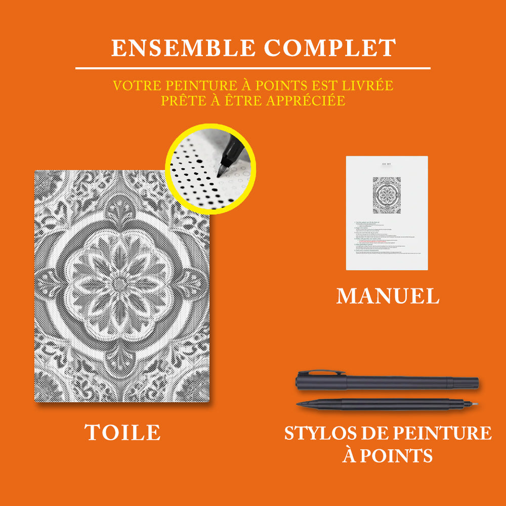 Nos kits personnalisés de peinture à points contiennent tout ce dont vous avez besoin pour commencer immédiatement :